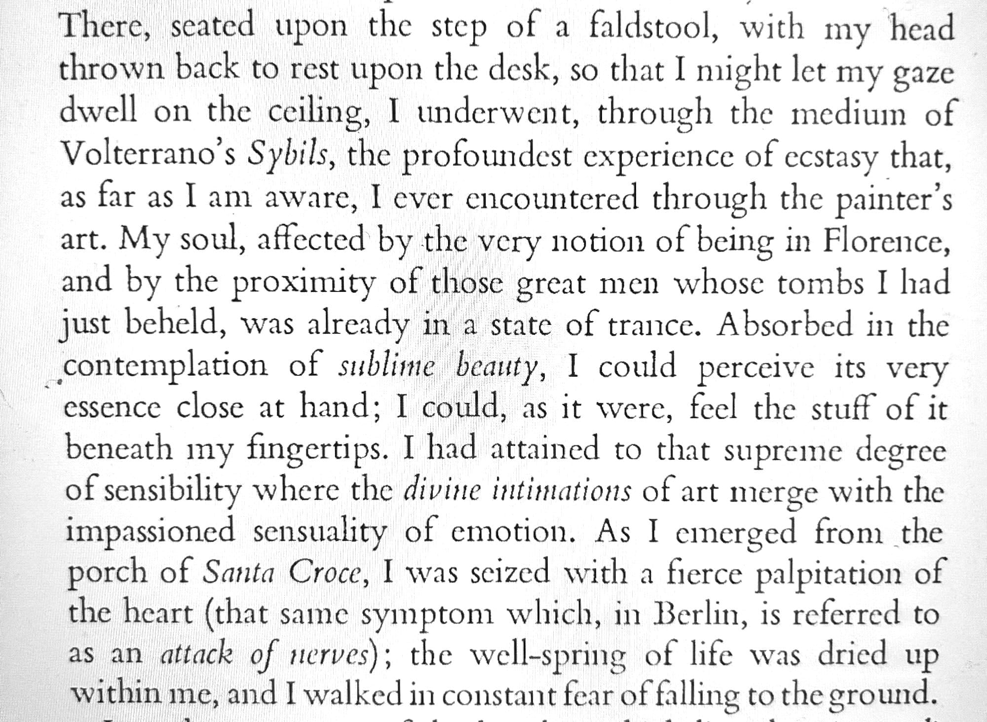 Even Stendhal himself, despite the initial rapture he felt gazing at such works, describes a dread– feeling drained by the overwhelming sensory experience when staring at the Basilica of Santa Croce ceiling. In his travelogue, Rome, Naples and Florence in 1817, he writes:
