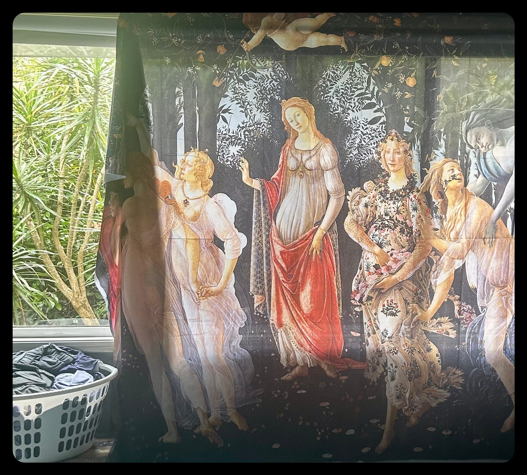 My bedroom window urgently needed a makeshift curtain. I got a cheap fabric wall tapestry of Botticelli's Spring and thumb-tacked it to the window. I've been waking up every morning to the sun shining through that cheap fabric, and it has ruined my tableau of ethereal friends for me; it's cheap, it's tainted, and it reminds me of a night of extreme nausea when I'm sure I saw one of Venus' eyes slide down her cheek. I call it Primavera Piss, and it's going in the bin when I move house soon.